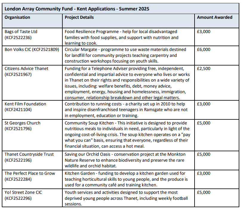 Again, for 2025, London Array has worked with Kent Community Foundation who managed the applications and distributed the £38,500 fund on behalf of the wind farm.